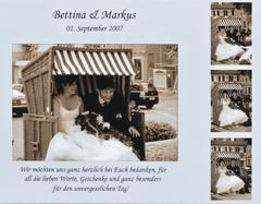 Wir möchten uns ganz herzlich bei Euch bedanken für all die lieben Worte, Geschenke und ganz besonders für den unvergesslichen Tag! <zur Hochzeit im Harprechtshaus Schopfloch am 01.09.2007> |